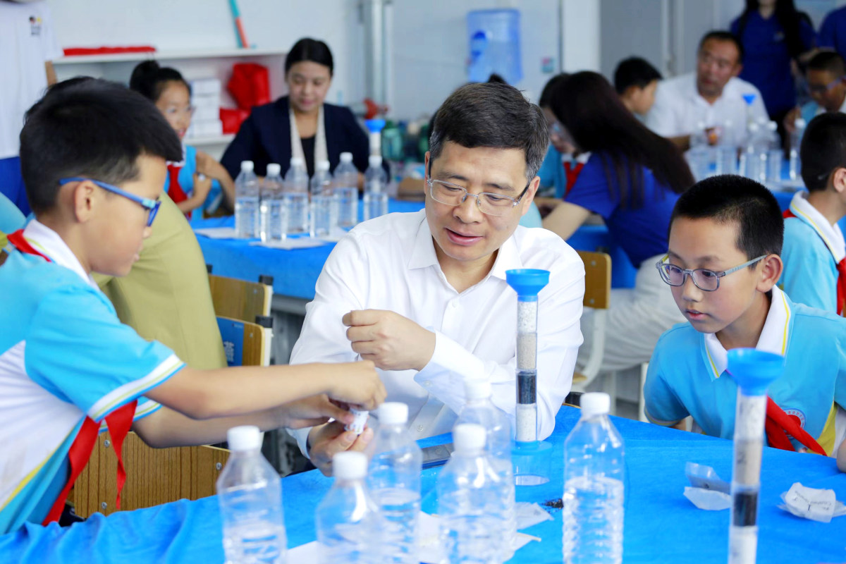 “水变得干净了!”课堂上学生们惊喜欢呼。“水博士”带着学生们组装了简易过滤装置,让带有颜色的脏水依次经过花岗岩石子、瓷沙、活性炭和石英砂,水变成干净透明的了,学生们由此明白了大自然里干净水的由来。此外,学生们还通过泡泡实验,知道了软硬水的区别。