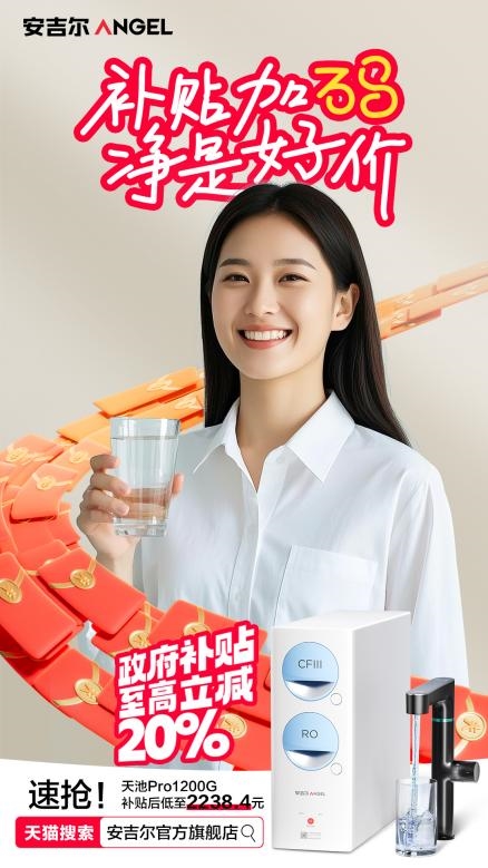 为了让更多用户享受品质净水生活,守护家庭用水健康,3月7日20点-3月8日20点起,安吉尔将准时开启3.8福利活动,购机可享政府补贴,购买净水类产品可至高省20%,还能叠加品牌专属礼遇,双倍补贴净享好价。