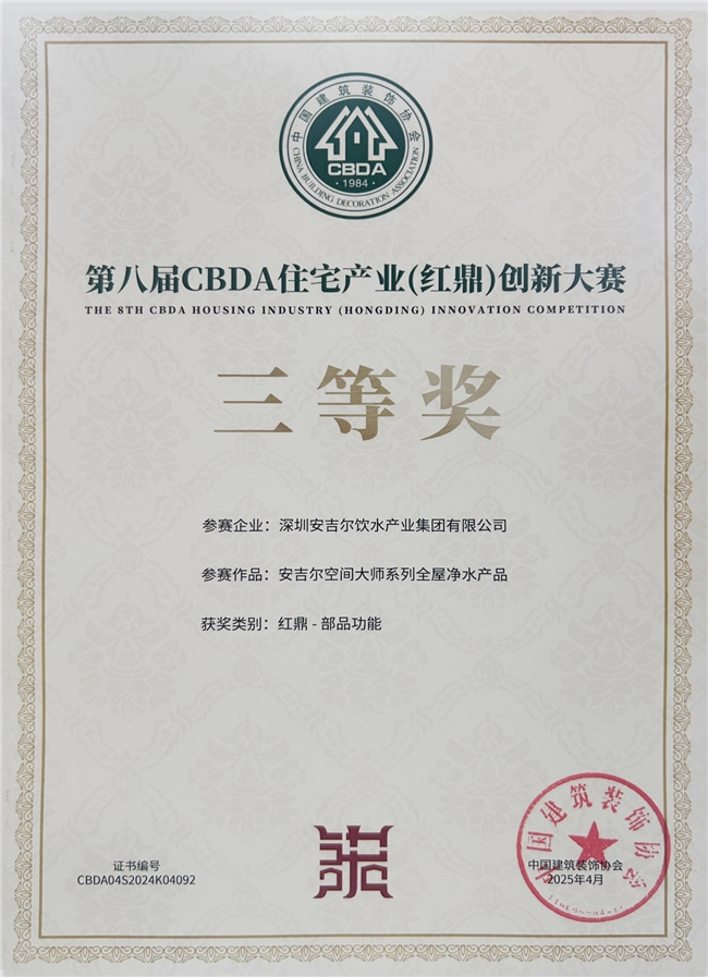 近日,由中国建筑装饰协会主办的第八届CBDA住宅产业(红鼎)创新大赛正式揭晓获奖名单。安吉尔集团旗下空间大师系列全屋净水产品凭借创新工业设计与卓越功能价值,从众多参赛产品中脱颖而出,荣膺部品功能类别“创新大赛三等奖”奖项。